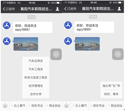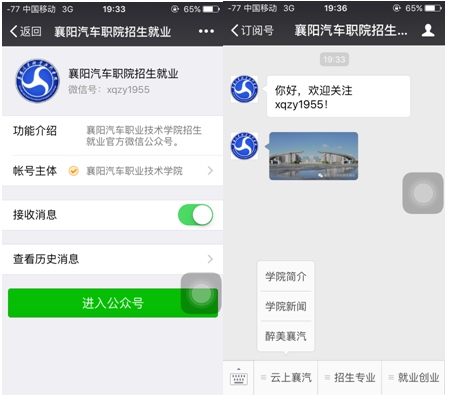 (通讯员:秦显峰)为借助新媒体的发展提升学院招生就业水平,更好地宣传学院的办学理念,在学院领导的重视关心下,我院1月22日正式开通启用“招生就业”微信公众号。通过微信平台,我们将以文字、图片、音频、视频等形式推送学院新闻、招生就业动态等资讯,为广大的师生提供更便捷的学院咨询和服务,用新媒体实现指尖有“位”来。同时,新媒体形式招生就业的积极开展,也将成为襄阳汽车职业技术学院招生就业工作中一个突出的亮点。在此欢迎广大师生、校友以及社会各界人士订阅关注我院“招生就业” 官方微信公众号,并对我们的工作提出宝贵的意见和建议。