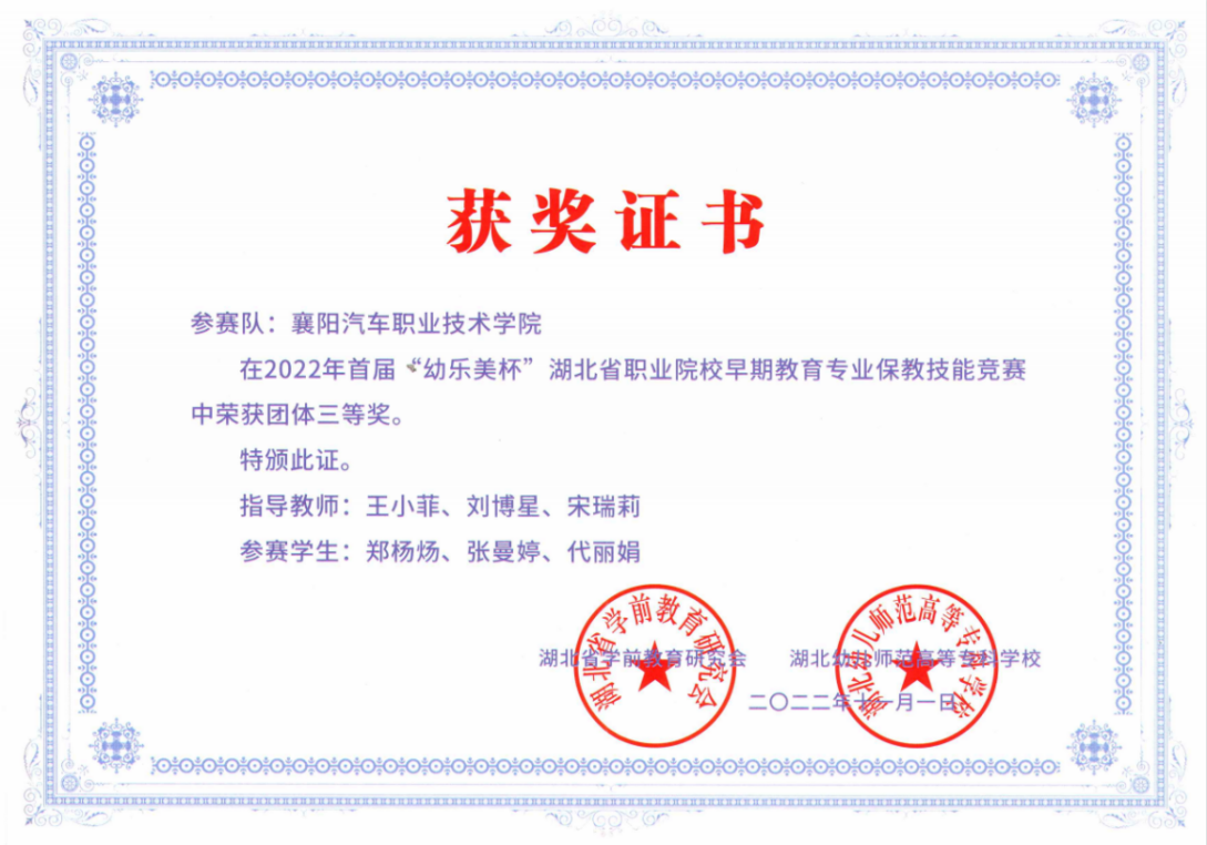 1.首届“幼乐美杯”湖北省职业院校早教职业竞赛中获团体三等奖