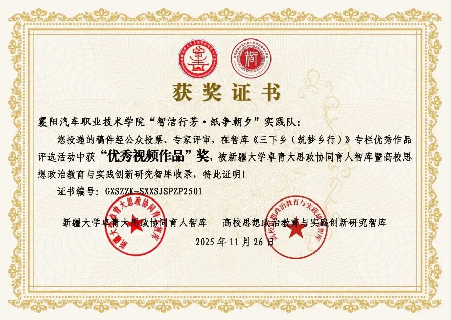 【喜报】襄阳汽车职业技术学院“智洁行芳˙纸争朝夕”实践队作品获双智库收录及两项奖励-招生信息网